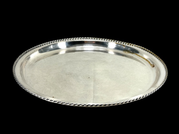 • METAL PRATEADO, uma (1) bandeja redonda confeccionada em metal espessurado a prata da manufatura BAND PLATE, borda decorada por gomos torcidos e apoiada sobre 3 pés em bilro, medindo 40cm de diâmetro com falhas na prateação.