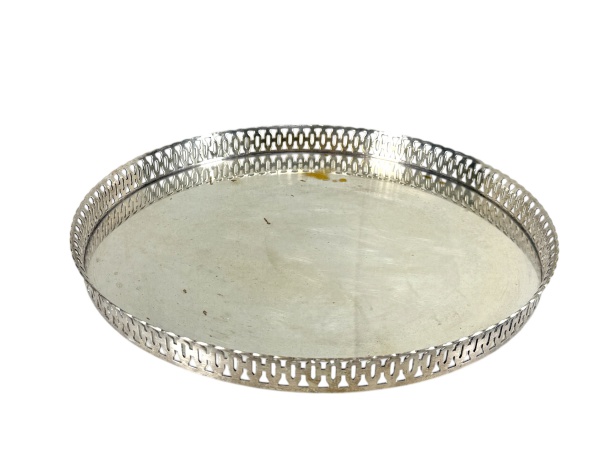 • METAL PRATEADO, uma (1) bandeja redonda confeccionada em metal espessurado a prata, fundo liso e galeria em vazados com ondulações na borda, medindo 36cm de diâmetro, falhas na prateação e ausência dos pés.