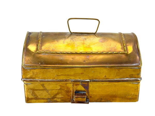 • METAL DOURADO - Uma (1) caixa porta-joias em metal dourado, no feitio de baú com tampa arqueada, alça superior e fecho frontal. Medida : 17 x 13 x 21 cm , desgastes na douração