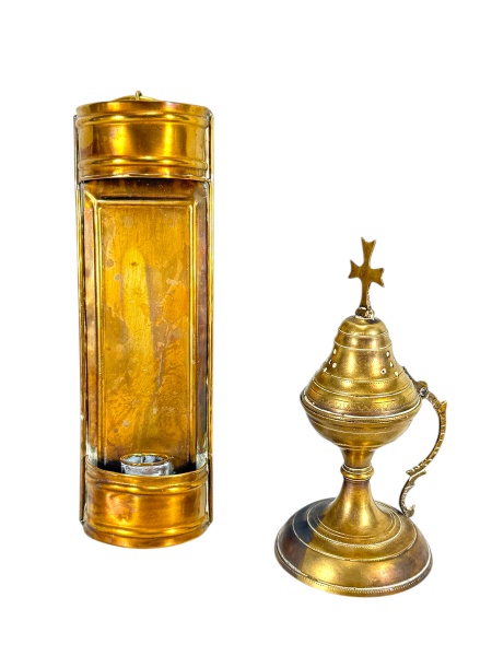 • ARTE SACRA e METAL DOURADO, lote com duas (2) peças, sendo: A) 1 incensário sacro confeccionado em bronze, corpo torneado encimado por cruz em recortes e base circular, medindo 20cm de altura e B) 1 castiçal de parede confeccionado em metal dourado, medindo 26,5x8,5cm.