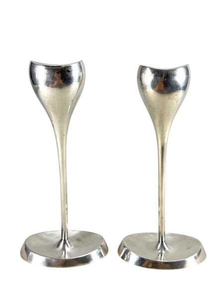 • METAL ALEMÃO, par (2) de castiçais confeccionados em metal espessurado a prata da manufatura ABSA, corpo cilíndrico apoiada sobre base oval, medindo 22cm de altura.