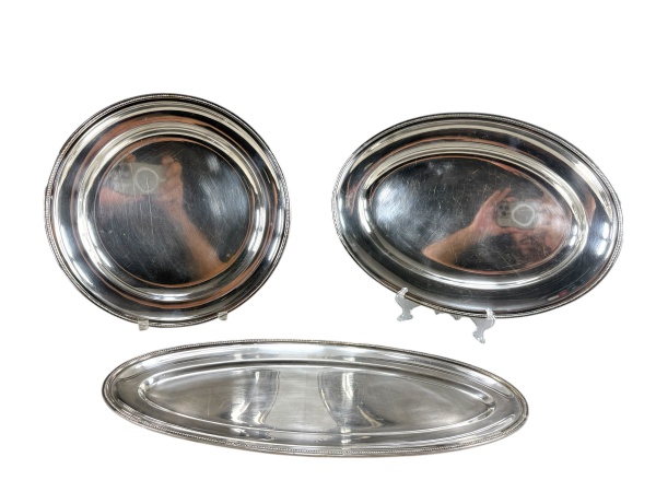 • METAL PRATEADO, três (3) travessas confeccionadas em metal espessurado a prata com borda cinzelada em perolados, sendo: A) 1 redonda, medindo 33cm e B) 1 oval, medindo 42x30cm e C) 1 para peixes, medindo 50x21cm, apresentam sinais de uso.