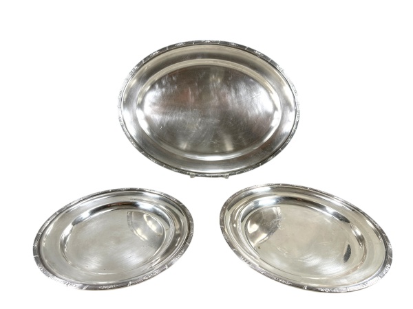 • METAL PRATEADO - Lote com (3) travessas confeccionadas em metal espessurado à prata , da manufatura Wolff sendo duas redondas e uma oval , bojo liso e bordas frisadas e contornadas por delicadas flores , medidas : 30 , 33 e 49 x 36 cm