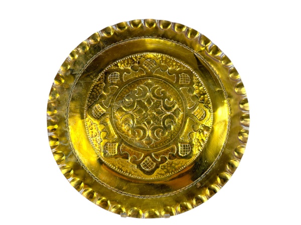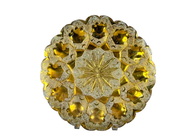 • METAL DOURADO - Um (1) prato decorativo em metal dourado, de formato circular recortado, com rica decoração vazada e gravada de composição geométrica e estrelada ao centro, medida : 29,5 cm