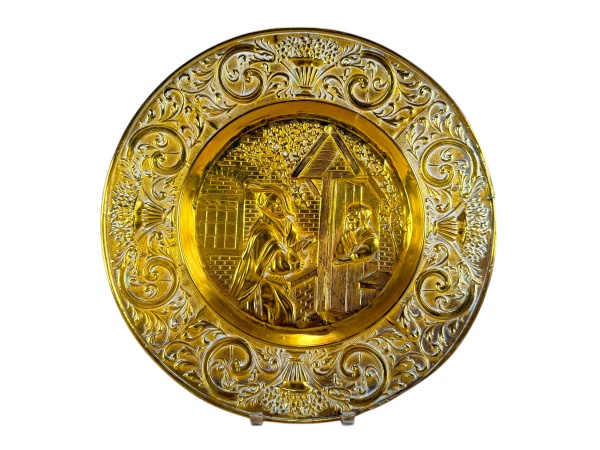 • METAL DOURADO  -  Um (1) medalhão decorativo em metal dourado, de formato circular, com cena em relevo representando figura campestre , ladeada por rica decoração em arabescos, folhagens e cestos florais. Medida : 43 cm