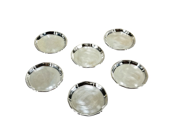 • METAL PRATEADO - (6) Porta copos confeccionados em metal espessurado à prata , bordas em recortes , medida : 11 cm