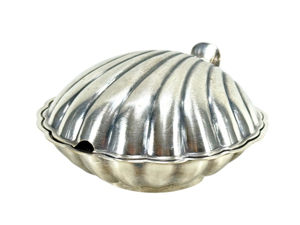 • METAL PRATEADO / EBERLE - Uma (1) manteigueira ou porta-joias em metal prateado, de formato concheado, com tampa articulada e interior com recipiente em vidro azul , não acompanha espátula . Medida : 6 x 13 x 13 cm