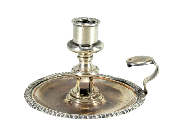 • METAL PRATEADO - (1) Castiçal palmatória confeccionada em metal espessurada à prata ,corpo torneado , borda cinzelada em gomos torcidos , apresenta falha na preteação , medida : 12 x 17 cm