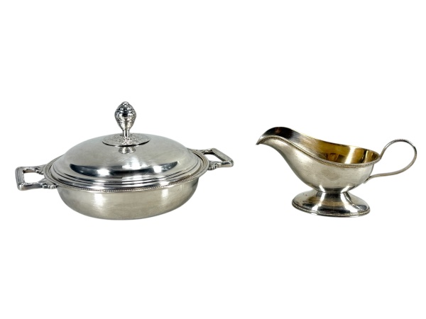 • METAL PRATEADO / WOLFF - Lote com (2) peças confeccionadas em metal espessurado à prata , sendo (A) - 1 legumeira , med : 15 x 30 cm e (B) - 1 molheira 8 x 20 x 9 cm , ambos cinzelados por frisos e pega da tampa da legumeira em feitio de pinha , falha na prateação da molheira .