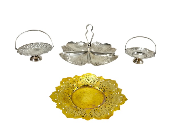 • METAL PRATEADO - Lote com (4) peças confeccionadas em metal espessurado à prata , com cinzelados vegetalista em vazados e recortes na borda , sendo (A) 1 petisqueira com 4 divisórias , med : 15 x 21 cm , (B) - 1 prato decorativo , med : 19 (com falhas na douração) e C- 2 porta alianças , medida : 12 x 10 cm e 14 x 12 cm