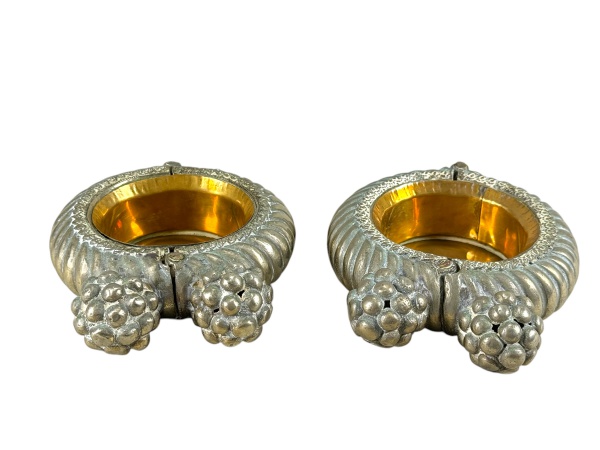 • METAL PRATEADO - Par de porta copos confeccionados em metal espessurado à prata , cinzelados por gomos torcidos e apliques de esferas peroladas , medida : 5 x 11 x 9 cm , apresentam desgastes no metal .