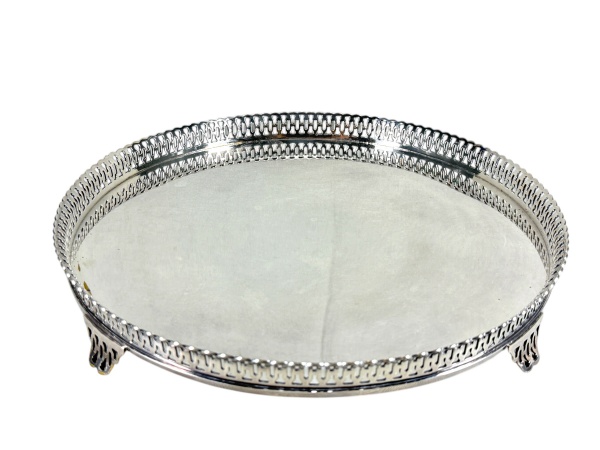 • METAL PRATEADO - (1) Bandeja de formato circular confeccionada em metal espessurado à prata , com galeria vazada apoiada sobre três pés curvos , medida : 6 x 41 cm