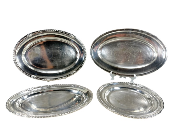• METAL PRATEADO - Lote com (4) travessas confeccionadas em metal espessurado à prata sendo (3) da manufatura Wolff , duas ovaladas e uma redonda com frisos cinzelados em gomos e folhagens , medidas : 29 / 37 x 25 e 42 x 30 cm  e (1) da manufatura Christofle , borda e corpo liso , possui diversas ranhuras , medida : 44 x 28 cm