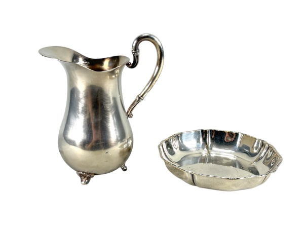 • METAL PRATEADO - Lote com (2) peças confeccionadas em metal espessurado à prata sendo (A)  - 1 jarra corpo liso , alça vazada e borda recortada , apoiado sobre três pés curvos , medida : 21 cm , possui mossa e (B) - 1 travessa redonda da manufatura Eberle , com cavidade funda e borda recortada , medida : 3,5 x 18 cm