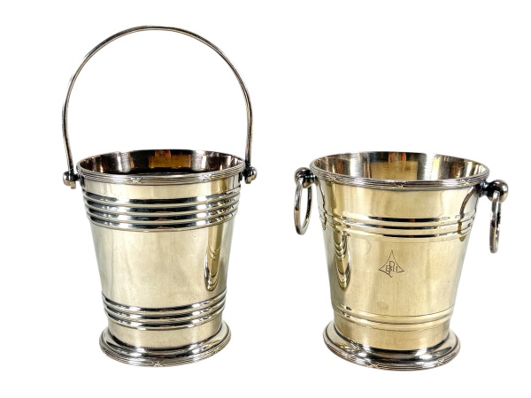 • METAL PRATEADO / FRACALANZA - (2) baldes para gelo confeccionados em metal espessurado à prata , bojos de formato cilíndrico levemente cônico, com frisos em relevo, bases alargadas e alças móveis laterais, bordas cinzeladas em caneluras e fitas cruzadas , medidas : 13 x 13 cm