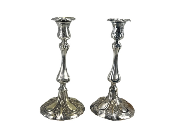 • METAL PRATEADO - Par de castiçais, de elegante feitio alongado, com bobeches recortados, fustes torneados e bases movimentadas em desenho lobulado, ricamente ornamentadas em relevo com motivos vegetalistas , medida : 28 x 13,5 cm