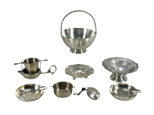 • METAL PRATEADO - Lote com (8) peças confeccionadas em metal espessurado à prata , modelos , marcas e tamanhos distintos , medida da peça maior : 14 x 13 x 12 cm / medida da peça menor : 4 cm