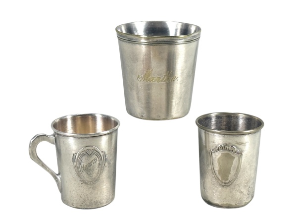 • METAL PRATEADO - Lote com (3) copos infantis confeccionados em metal espessurado à prata , sendo 1 da manufatura Christofle , med : 8 x 8 cm e os outros dois possivelmente da manufatura Wolff , medidas : 6,5 x 5,5 cm e 7 x 5,5 cm