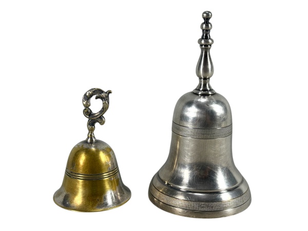 • METAL PRATEADO - Lote com (2) sinetas de mesa confeccionadas em metal espessurado à prata , medidas : 8 e 13 cm
