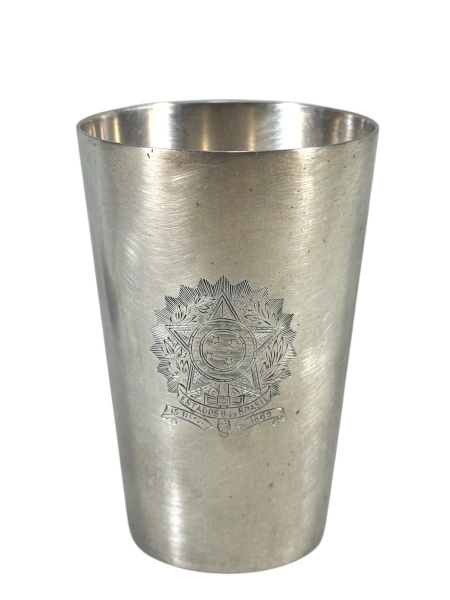 • METAL PRATEADO / W.M.F - (1)  Copo confeccionado em metal espessurado à prata da manufatura W.M.F , gravação central representando brasão da República , medida : 8,5 x 6 cm