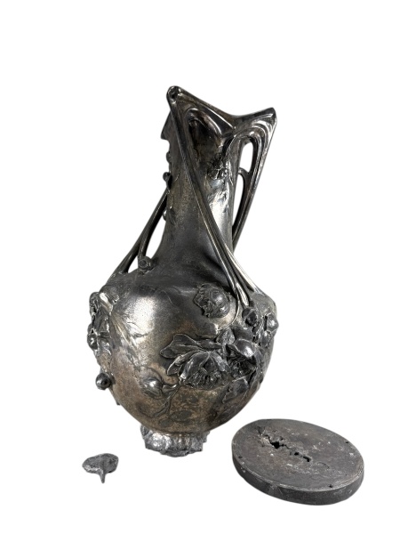 • ESTANHO, um (1) grande vaso confeccionado em estanho, ao gosto art noveau, ricamente decorado por flores e folhagens em relevo na peça, apresenta desgastes e perdas na peça, vendido no estado da foto, medindo 65cm de altura.