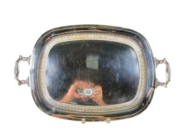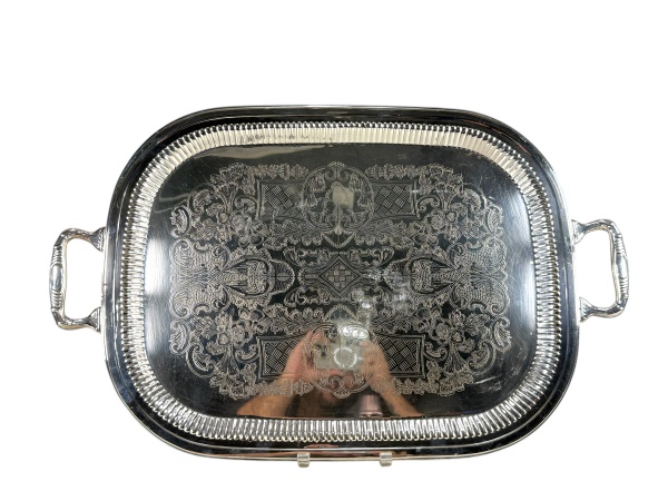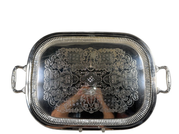 • METAL PRATEADO, uma (1) grande bandeja retangular confeccionada em metal espessurado a prata, fundo com rico cinzelado de elementos florais e vegetalistas, galeria em gomos, alças vazadas e banho em bom estado com leves sinais de uso, medindo 67x42,5cm.