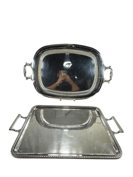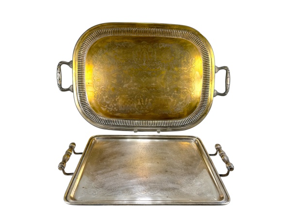 • METAL PRATEADO, duas (2) bandejas retangulares, confeccionadas em metal espessurado a prata, sendo: A) BELLINI, uma com rico cinzelado de elementos florais e vegetalistas, galeria em gomos e alça vazada, necessita banho, medindo 67x43cm e B) BEL PRATA, uma com rico cinzelado de elementos vegetalistas e alças laterais vazadas em torneados, medindo 49,5x33cm, falhas na prateação.