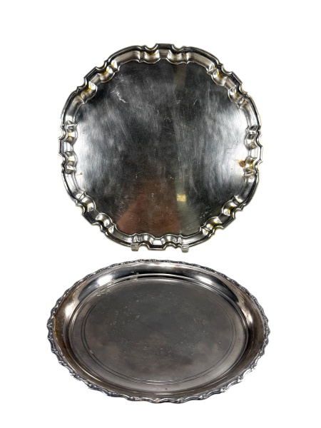 • METAL PRATEADO - Lote com (2) bandejas confecccionadas em metal espessurado à prata , sendo (A) Uma da manufatura SAHIR de formato circular , parte central lisa e borda recortada , med : 37 cm e (B) - Uma da manufatura Rogers Quadruple com borda recortada cinzelada em folhagens , medida : 27 cm , apresenta desgastes .
