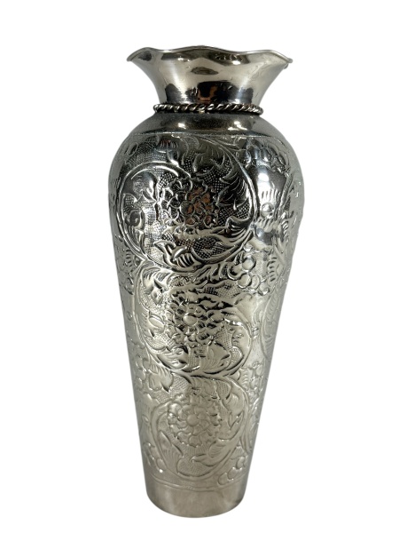 • METAL PRATEADO - Um (1) vaso floreiro em metal prateado, de formato bojudo alongado, com borda recortada, com friso torcido e corpo ricamente ornamentado em relevo com motivos florais, folhagens e arabescos. Medida : 41 x 14 cm , possui mossas .
