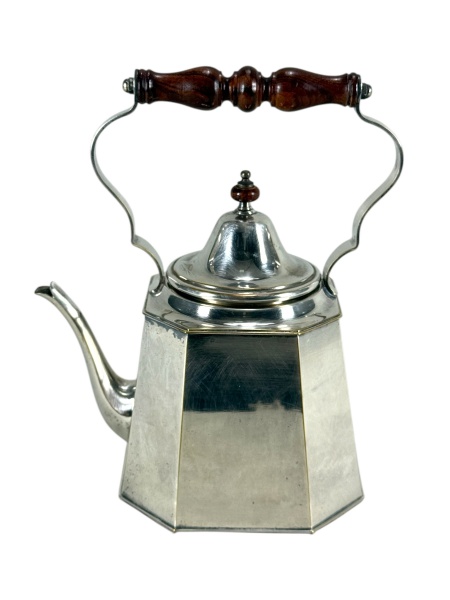 • METAL PRATEADO / D'ARTISAN - (1) Chaleira oitava confeccionada em metal espessurado à prata , corpo liso , alça articulada e pega da tampa em madeira  torneada , medida : 26 x 19 cm