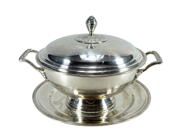 • METAL PRATEADO / WOLFF - (1) Sopeira com presentoir confeccionado em metal espessurado à prata , manufatura Wolff bojo liso , bordas peroladas e pega da tampa no feitio de pinha , medida : 22 x 32 x 30 cm .