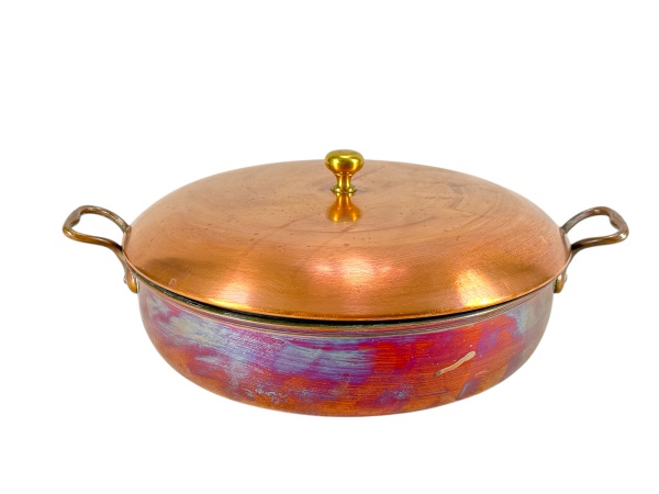 • METAL COBREADO - (1) Panela com tampa, confeccionada em metal cobreado de formato circular, com alças laterais aplicadas e pega superior. Medida: 13 x 35 x 30 cm