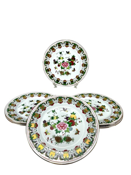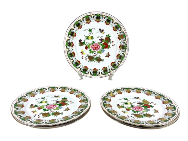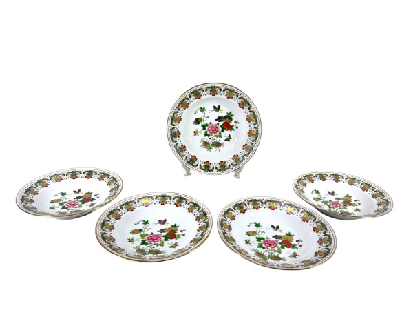 • PORCELANA ORIENTAL, cinco (5) pratos fundos confeccionados em porcelana na tonalidade branca, decorada por flores, folhagens e frutos em rica policromia com filetes e realces em ouro, medindo 20cm de diâmetro.