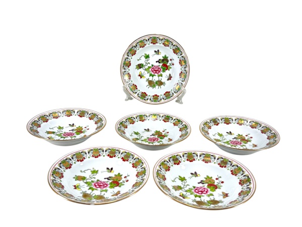 • PORCELANA ORIENTAL, seis (6) pratos fundos confeccionados em porcelana na tonalidade branca, decorada por flores, folhagens e frutos em rica policromia com filetes e realces em ouro, medindo 20cm de diâmetro.
