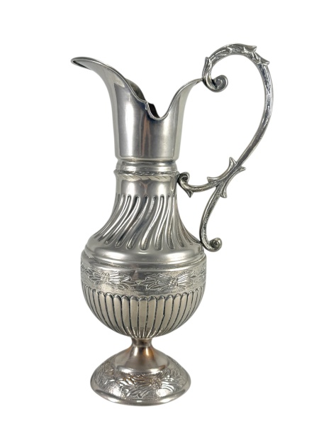 • METAL PRATEADO - (1) Grande jarra confeccionada em metal espessurado à prata , corpo em caneluras e gomos torcidos , bico vertedor alongado, alça lateral vazada em desenho sinuoso e pé circular ornamentado em relevo com motivos florais. Medida : 40 x 21 cm