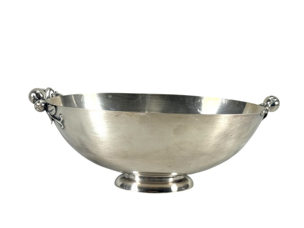 • METAL PRATEADO / WILCOX - (1) Fruteira /centro de mesa, de formato ovalado, com bojo liso , apresentando alças laterais estilizadas com frutos e folhagens . Medida : 12 x 31 x 18 cm