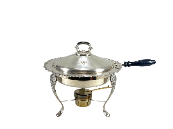 • METAL PRATEADO - Um (1) rechaud confeccionado em metal espessurado à prata de feitio circular, apresentando borda recortada e ornamentada, pega superior em argola, cabo lateral em madeira e estrutura apoiada sobre pés recurvos, com suporte inferior para aquecimento. Tampa com monograma gravado com as letras R e W . Necessita de banho , medida : 30 x 44 x 35 cm
