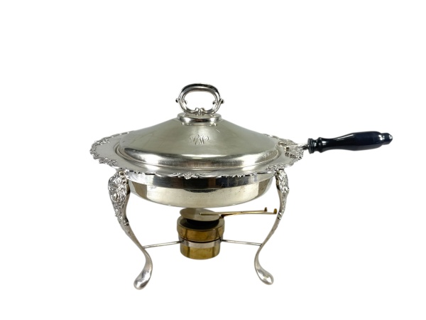 • METAL PRATEADO - Um (1) rechaud confeccionado em metal espessurado à prata de feitio circular, apresentando borda recortada e ornamentada, pega superior em argola, cabo lateral em madeira e estrutura apoiada sobre pés recurvos, com suporte inferior para aquecimento. Tampa com monograma gravado. Necessita de banho , medida : 30 x 44 x 35 cm