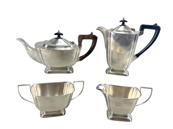 • METAL INGLÊS E.P.N.S  - Parte de serviço para chá / café confeccionado em metal espessurado à prata , sendo (1) bule para chá med : 17 x 19 cm  , (1) bule para café , med : 19 x 22 cm  , (1) açucareiro para torrão  , med : 9 x 17 x 8 cm  e (1) cremeira , med : 9 x 15 x 7 cm , corpos facetados, bases retangulares, tampas encaixadas e alças em madeira .