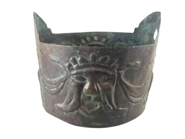 • COBRE -  Um (1) cachepot em cobre, de formato circular, com decoração em relevo representando carrancas , possuindo recortes laterais para pega , possui mossas no fundo , medida : 26 x 28 x 28 cm