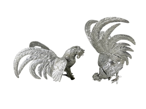 • ESCULTURAS, duas (2) esculturas confeccionadas em alumínio representando galos de rinha, medindo 17 x 30 cm  e 23x25cm. Um deles com pé adaptado com durepox