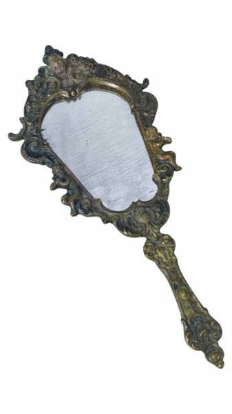 • BRONZE EUROPEU, um (1) espelho de mão, confeccionado em bronze com rico cinzelado de elementos vegetalistas, florais, concheados e querubins em relevo com recortes na borda, tampa traseira com sinais de oxidação, necessita troca do espelho, medindo 25,5x11cm.
