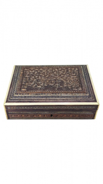 • DIVERSOS, uma (1) caixa porta joias, confeccionada em madeira entalhada por cena com elefante e leão com elementos florais e vegetalistas, marchetaria de elementos geométricos com desgastes e incrustações de ossos nas laterais, não possui chave, desgaste na forração interna com sinais de cola, medindo 6x20x15cm, apresenta falhas na marchetaria.