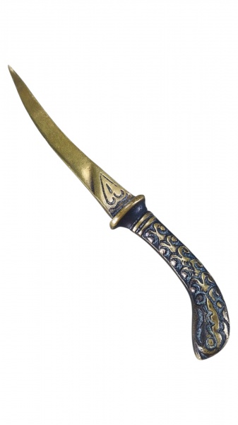 • BRONZE, um (1) abridor de cartas, confeccionado em bronze, no feitio de adaga turca, cabo cinzelado por elementos abstratos, apresentando mossa na lâmina, medindo 14cm de comprimento.