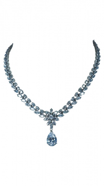 • JOIA, uma (1) gargantilha, confeccionada em PRATA DE LEI, contrastada 925, com rica incrustação de cristais facetados translucidos, centro com pingente no feitio de flor com pendente em gota, medindo 44cm de comprimento e peso total bruto 59g.