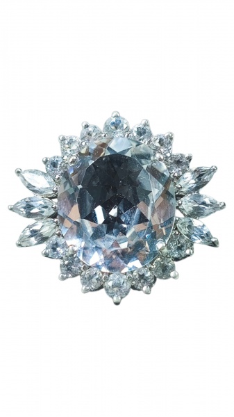 • JOIA, um (1) anel, confeccionado em PRATA DE LEI, contrastada 925, ricamente incrustado por cristais facetados com cabochão ao centro, aro 17 e peso total bruto 9g.