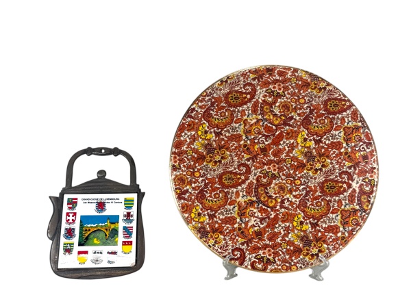 • FAIANÇAS, lote com duas (2) peças, sendo; A) MAUÁ TRENZINHO, um (1) prato para bolo confeccionado em faiança vitrificada na tonalidade creme, ricamente decorada por elementos florais e vegetalistas em policromia com borda filetada a ouro, apresenta marcas do tempo, falhas na pintura e na douração, medindo 31cm e B) 1 descanso para panela em bronze no feitio de chaleira com incrustação de azulejo com pintura de brasões de cidades distintas, medindo 20,5x14,5cm.