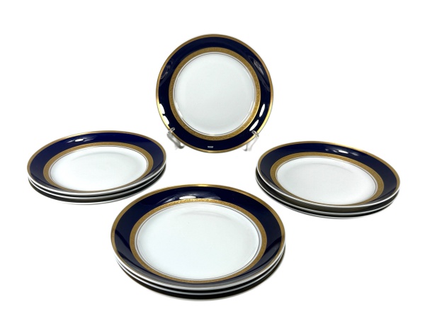 • PORCELANA STEATITA, oito (8) pratos rasos confeccionados em porcelana nacional na tonalidade branca, decorada por espessa faixa na tonalidade azul cobalto e faixa em ouro com elementos vegetalistas, 1 bicado, medindo 24,5cm.