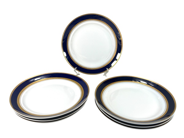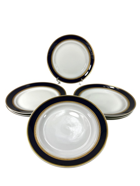 • PORCELANA STEATITA, sete (7) pratos rasos confeccionados em porcelana nacional na tonalidade branca, decorada por espessa faixa na tonalidade azul cobalto e faixa em ouro com elementos vegetalistas, medindo 24,5cm.