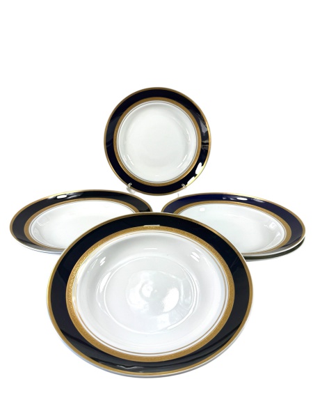 • PORCELANA STEATITA, seis (6) pratos fundos confeccionados em porcelana nacional na tonalidade branca, decorada por espessa faixa na tonalidade azul cobalto e faixa em ouro com elementos vegetalistas, medindo 23,5cm.